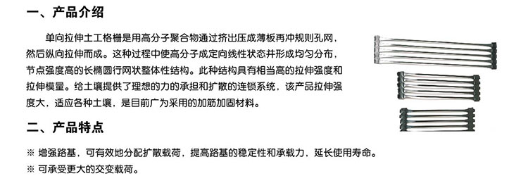 單向拉伸的土工格柵是由高分子聚合物經擠出壓成薄板再沖規則孔網,然后縱向拉伸而成。這種過程中使高分子成定向線性狀態并形成分布均勻、節點強度高的長 橢圓形網狀整體性結構。此種結構具有相當高的拉伸強度和拉伸模量,特別是我公司此類產品更具有超國際水平的高早期(伸長率在2%—5%)拉伸強度和拉伸模 量。給土壤提供了理想的力的承擔和擴散的連鎖系統。該產品拉伸強度大(>150Mpa),適應各種土壤,是目前廣為采用的加筋加固材料。